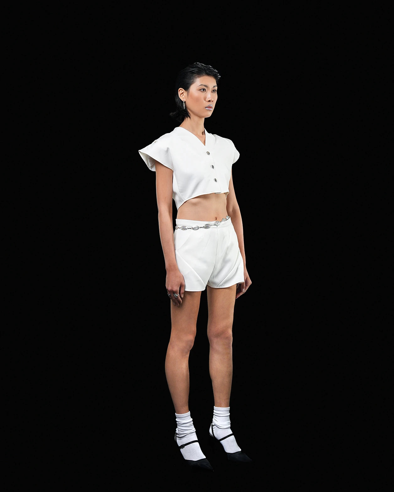 Sharp yet weightless, FOLD is constructed with angled panels and clean lines. Designed for motion, the garment balances form and breathability—its structure light, but its presence exact. Crafted in a matte technical poly blend. Pairs with SLIP for a full expression of air in movement.
