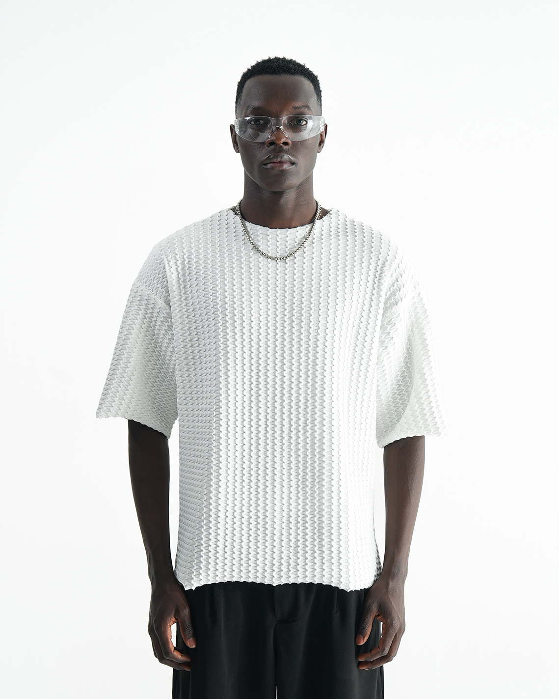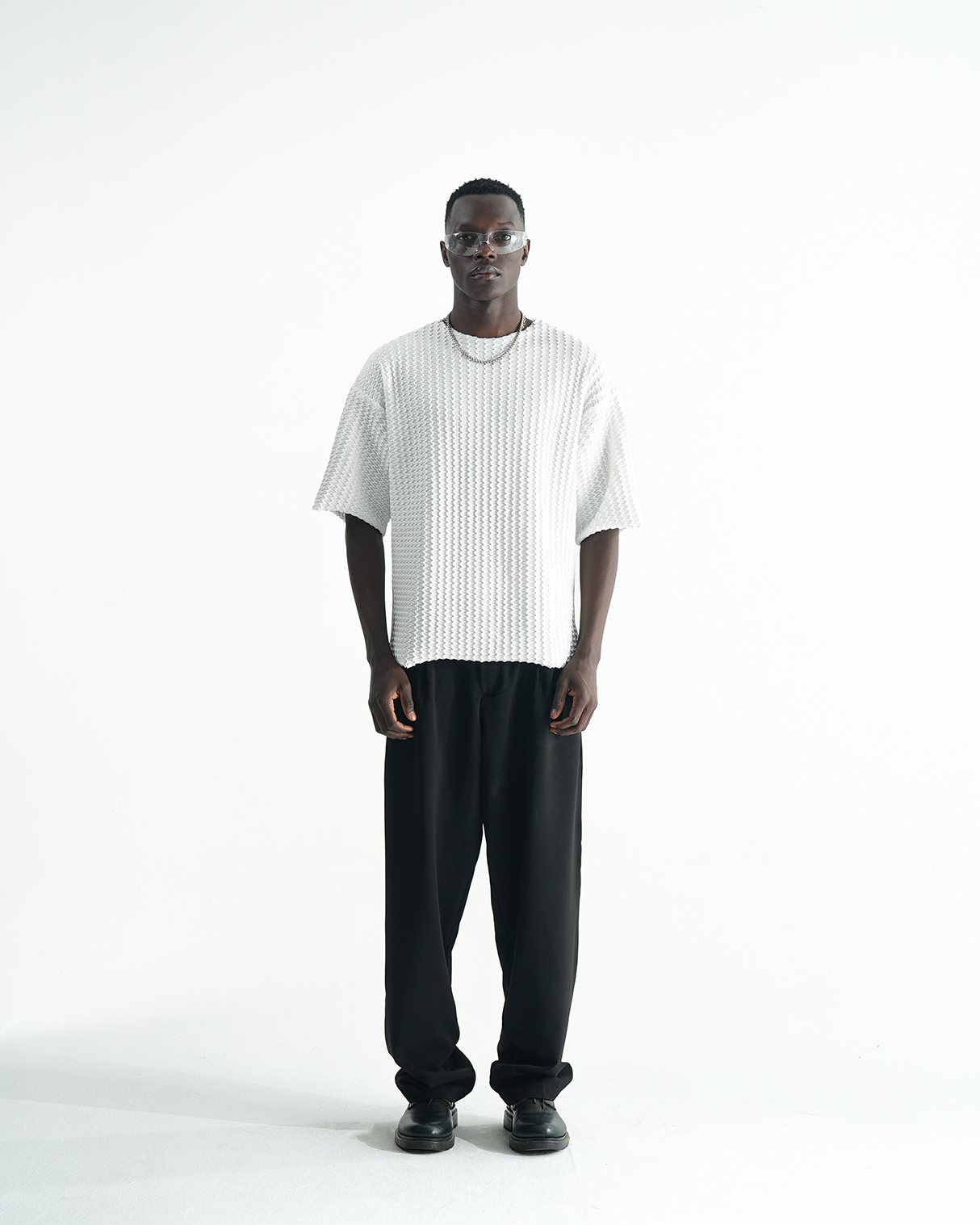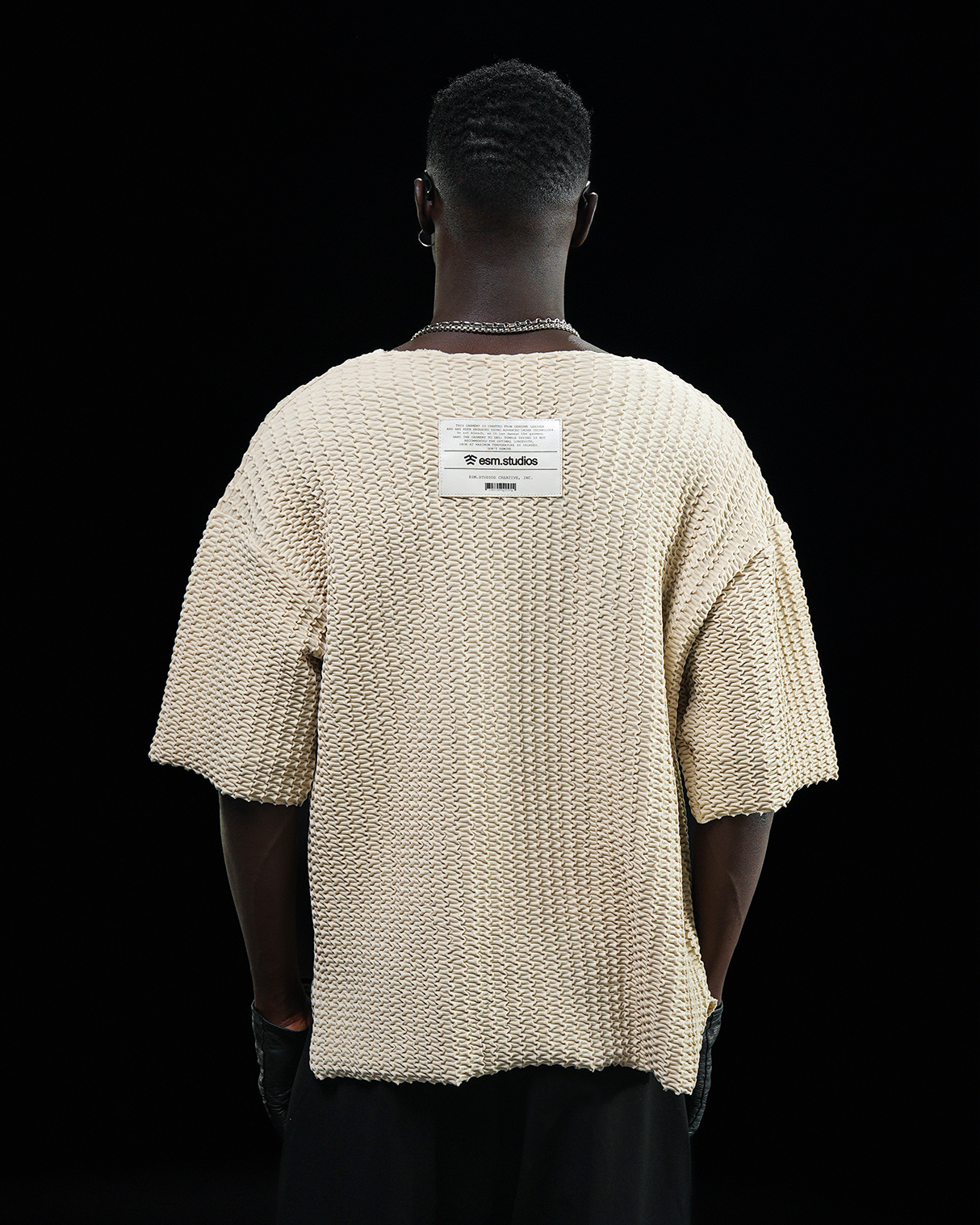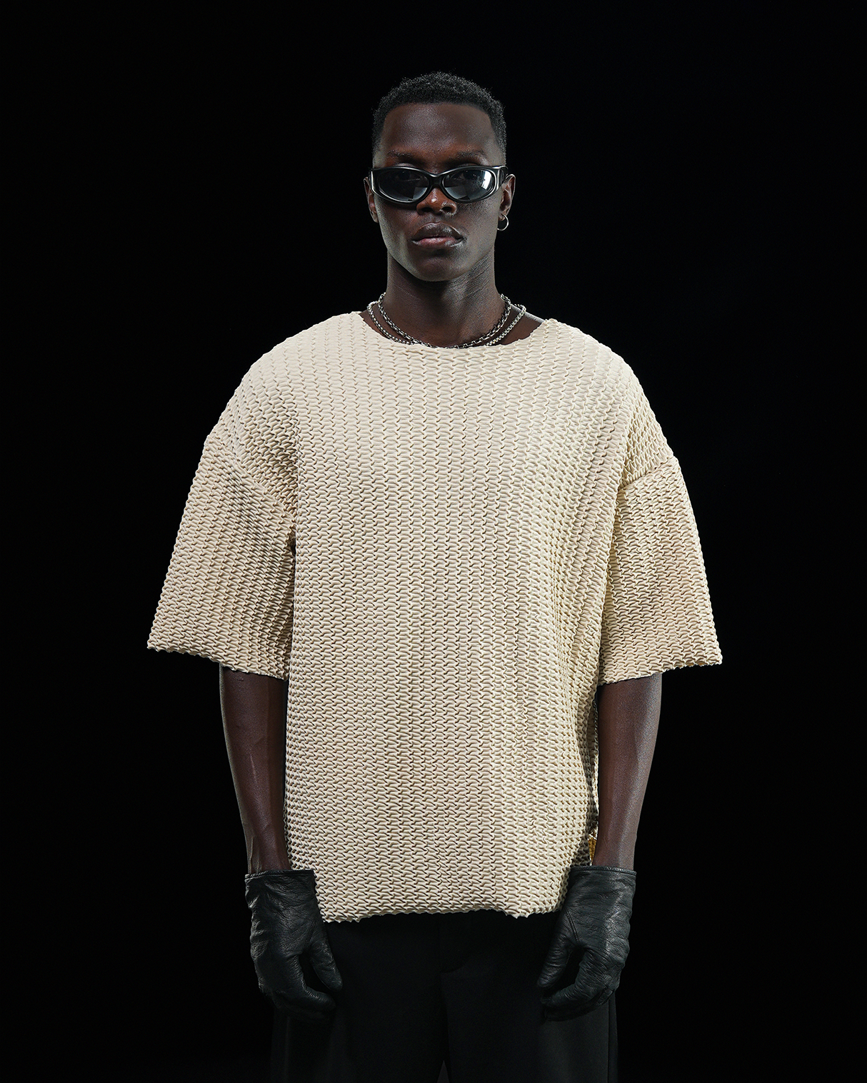 ECHO is an oversized knit shirt engineered with a subtle grid texture that catches light like sound. Its airy form and dropped-shoulder cut reflect rhythm in stillness—like a frequency worn across the body. Crafted from a breathable waffle-knit cotton blend that wears like presence.